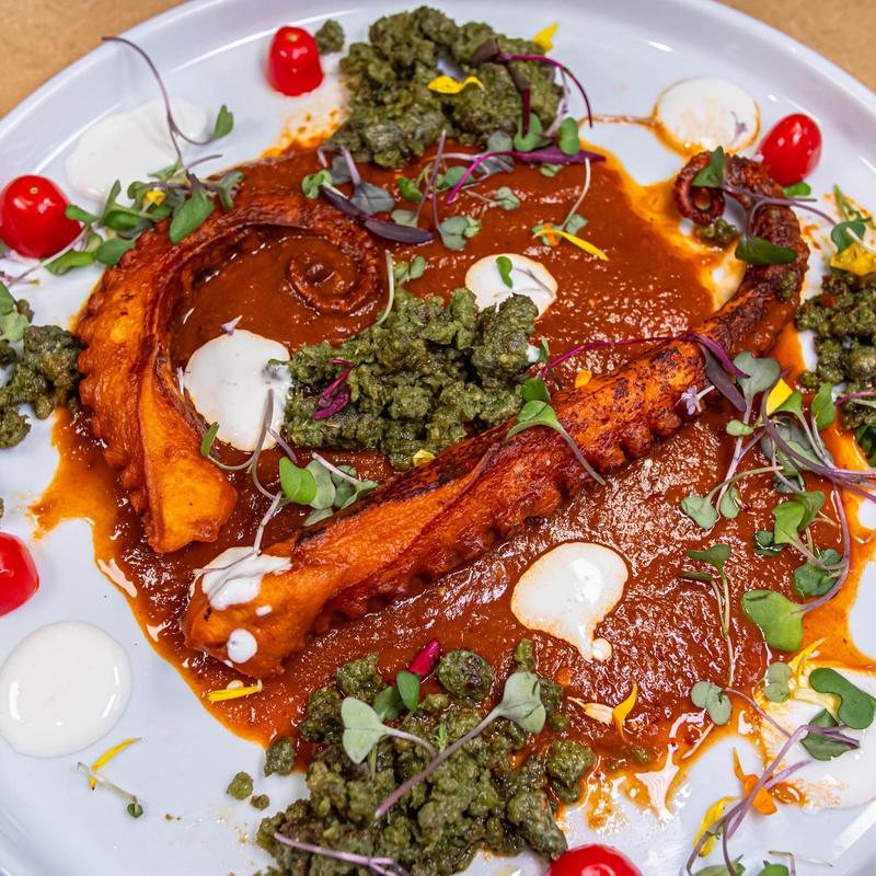 Wood-grilled octopus, purple potato, green chorizo, red tomatillo sauce.